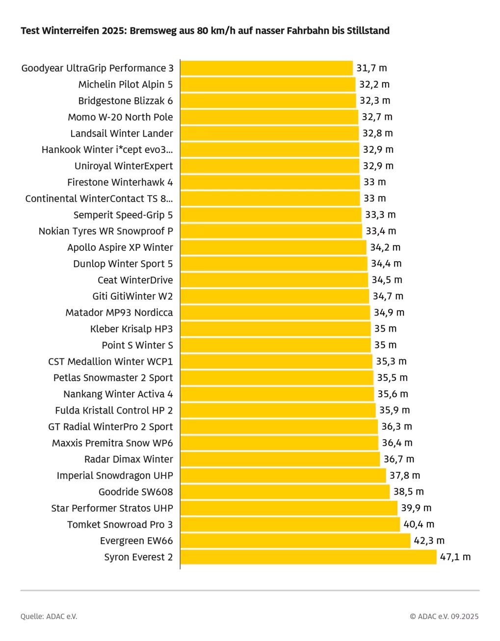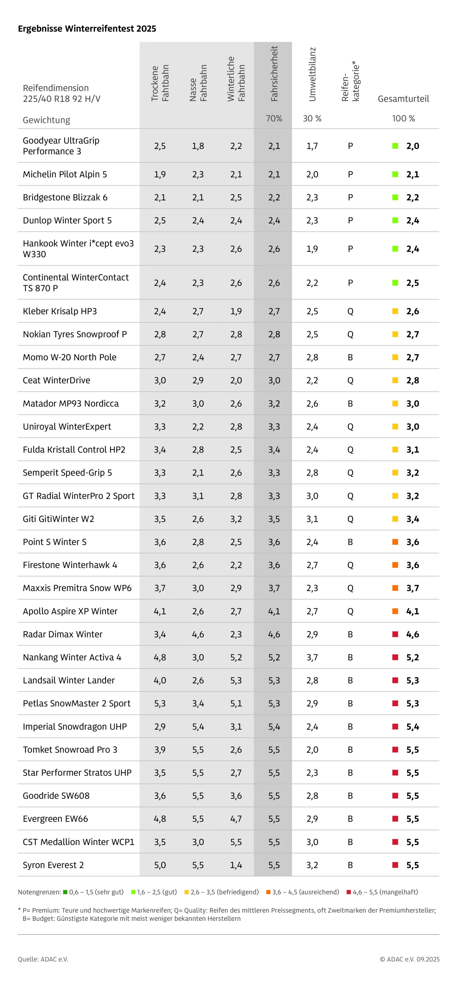 Германският клуб ADAC публикува резултатите от зимния тест 2025 за размера 225/40 R18 – често срещан при компактни и среден клас автомобили. Според ADAC, Goodyear UltraGrip Performance 3 печели с обща оценка 2,0, следван от Michelin Pilot Alpin 5 с 2,1. Значима част от евтините модели получават оценка „не се препоръчва“ заради слаба безопасност на мокро/лед.